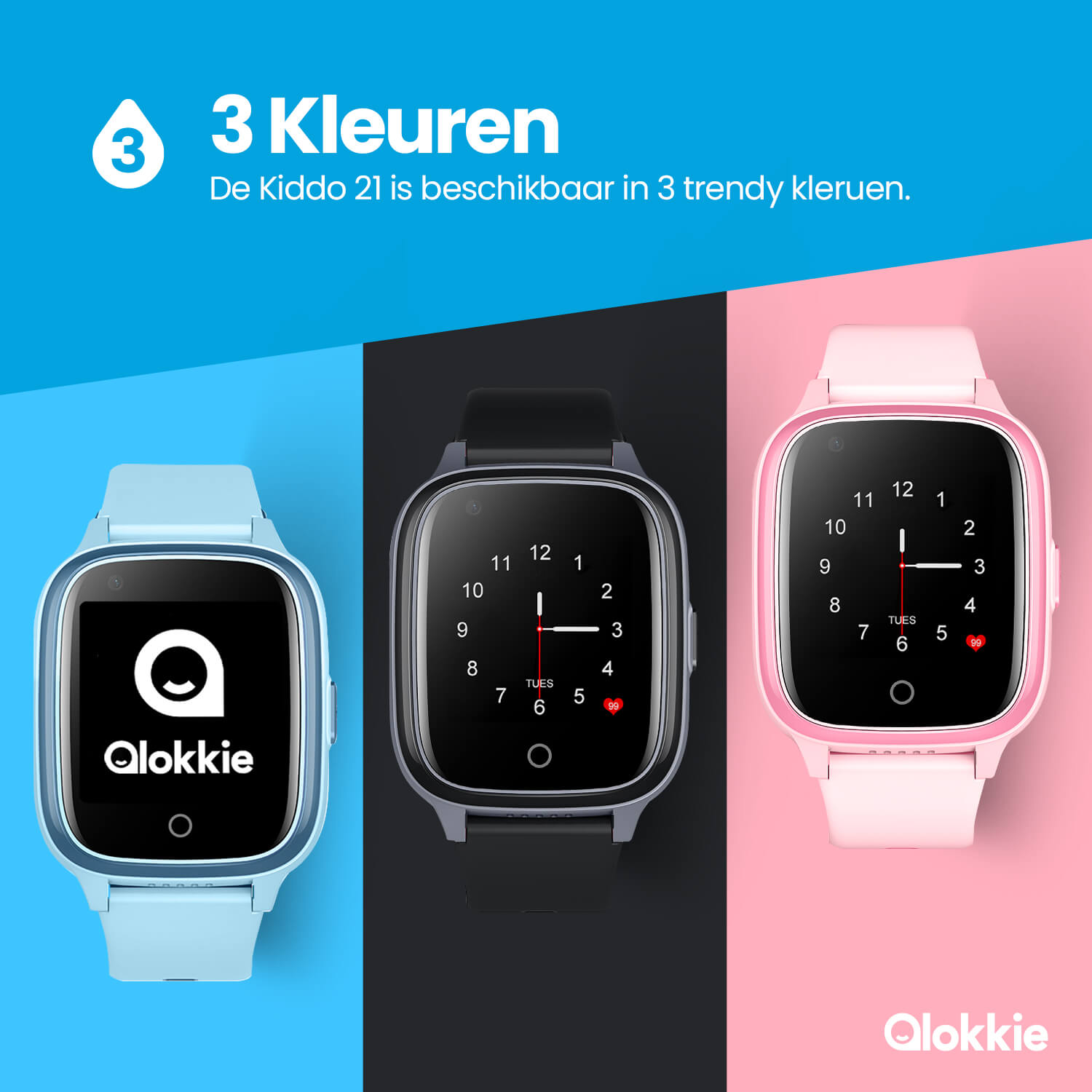 The Kiddo 21, one of our first and most popular models, is available in black, blue, and pink. This watch offers several high-quality features, including GPS tracking, route playback, text messaging, video calling, a calculator, pedometer, low-battery notifications, removal notifications, an alarm clock, a do-not-disturb function, and the ability to remotely turn off the watch.