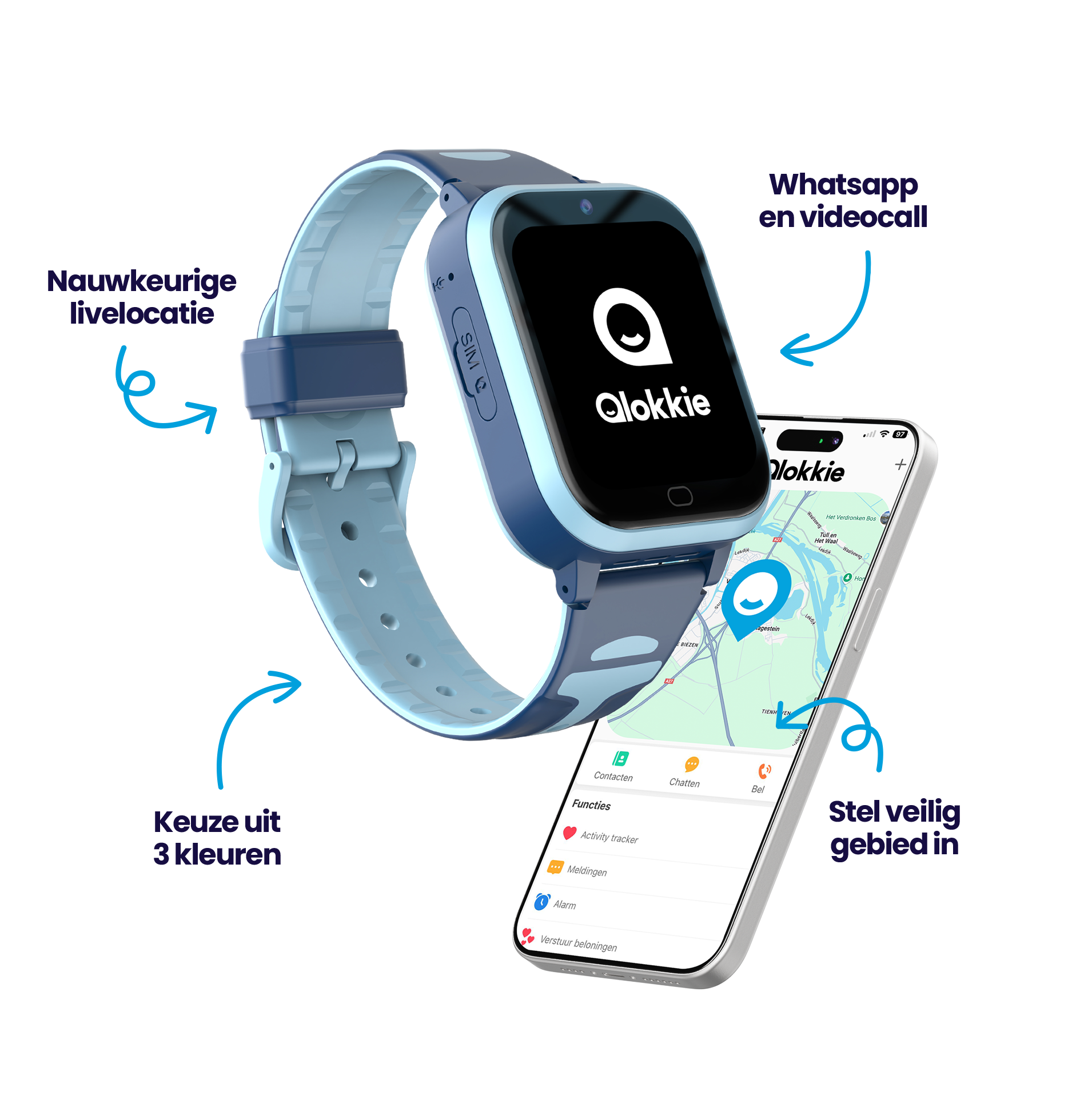 Qlokkie biedt een gratis app voor uw telefoon waarmee u op ieder moment de locatie van uw kind kunt zien, op 5 meter nauwkeurig. Het GPS-horloge is voorzien van handige functies als spraakberichten, videobellen en een SOS-functie waarmee uw kind u altijd onmiddellijk kan bereiken.